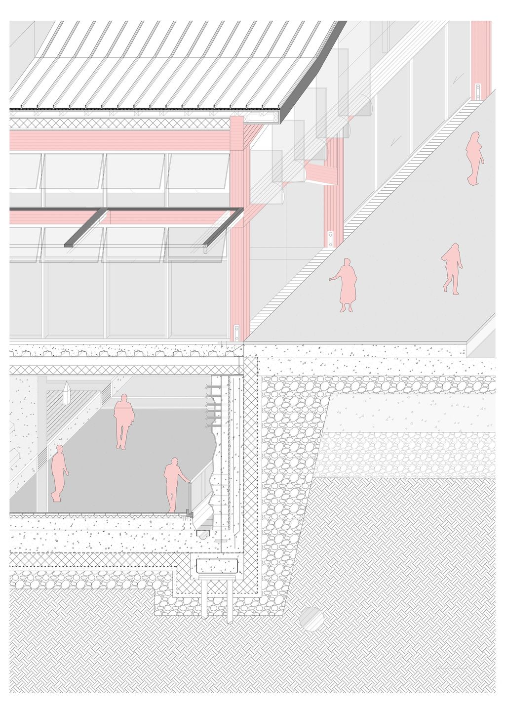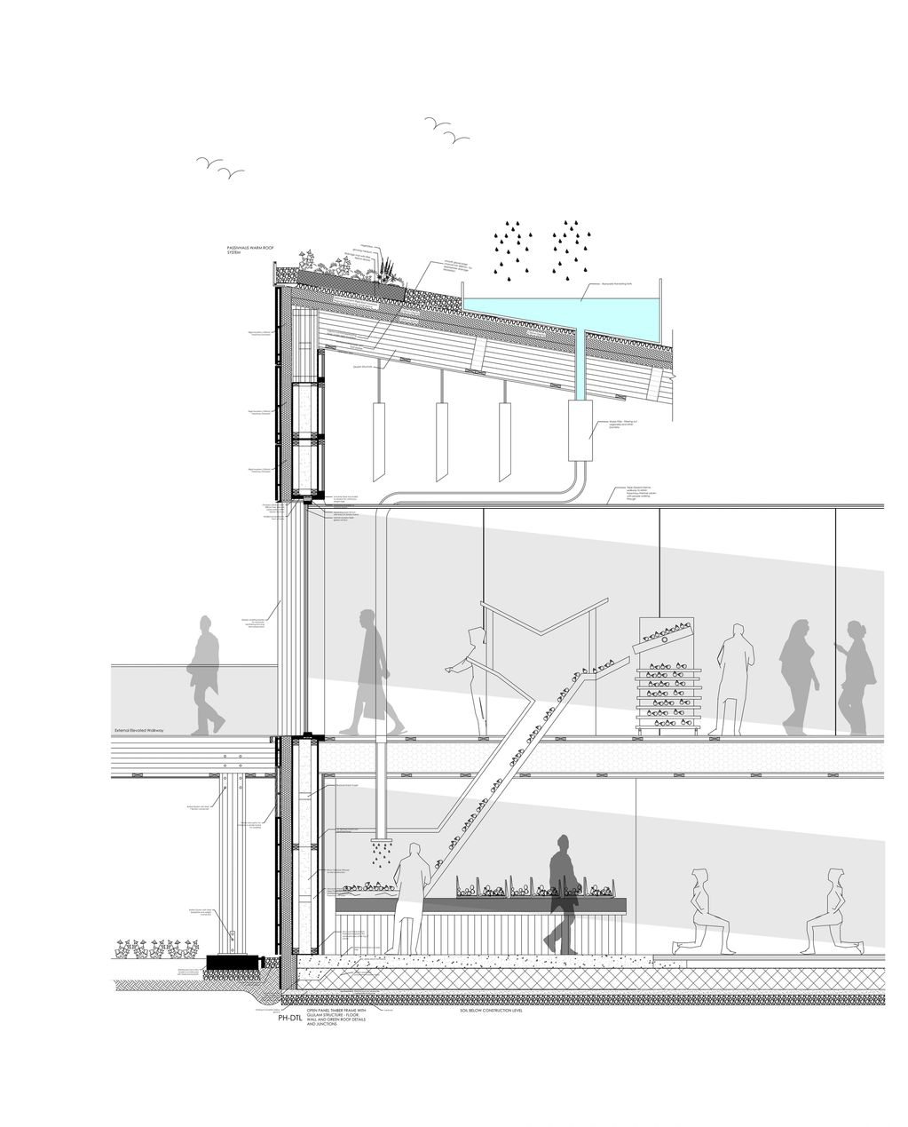 Detail section, showing inhabitation and interactive features that the occupants could be involved with for the additional programmatic design feature of self-sufficiency and community recreational activities: