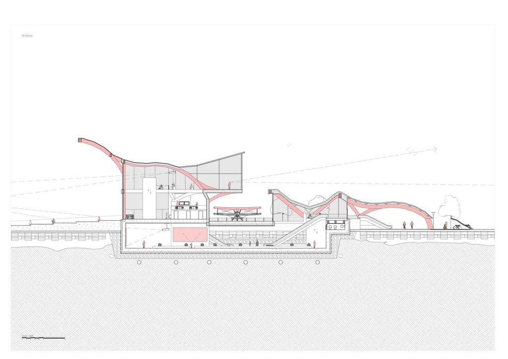 The geometry of the building looks to form a progressive shape, by which the visitors feel like they pass through on a journey, first underground then upwards towards the present day of observing the site and visualising the site’s future.
